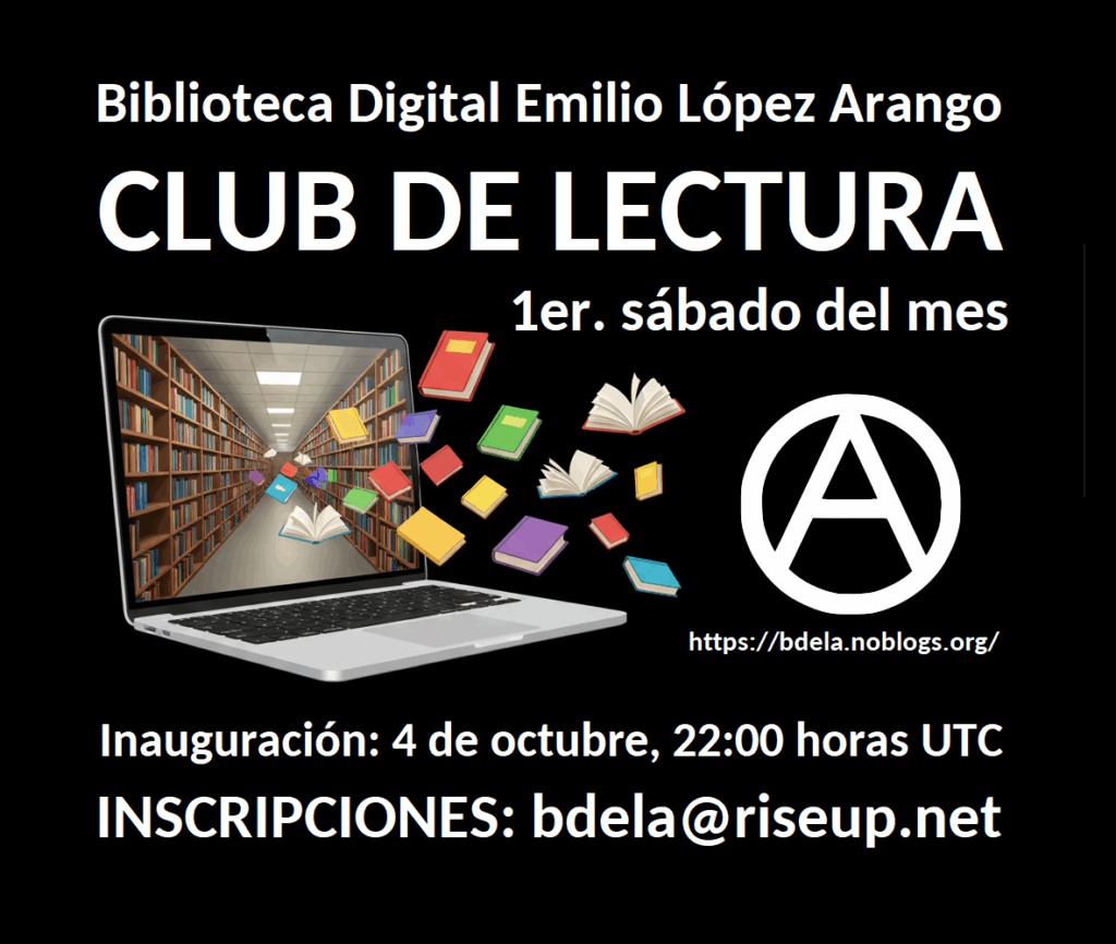 La Biblioteca Digital Emilio López Arango – BDELA, presenta su Club de Lectura, un espacio virtual e internacional -en español-, de personas que se encuentran para conversar sobre la lectura previa de un mismo texto relacionado al anarquismo, cultivando un ambiente de respeto, tolerancia y participación.
